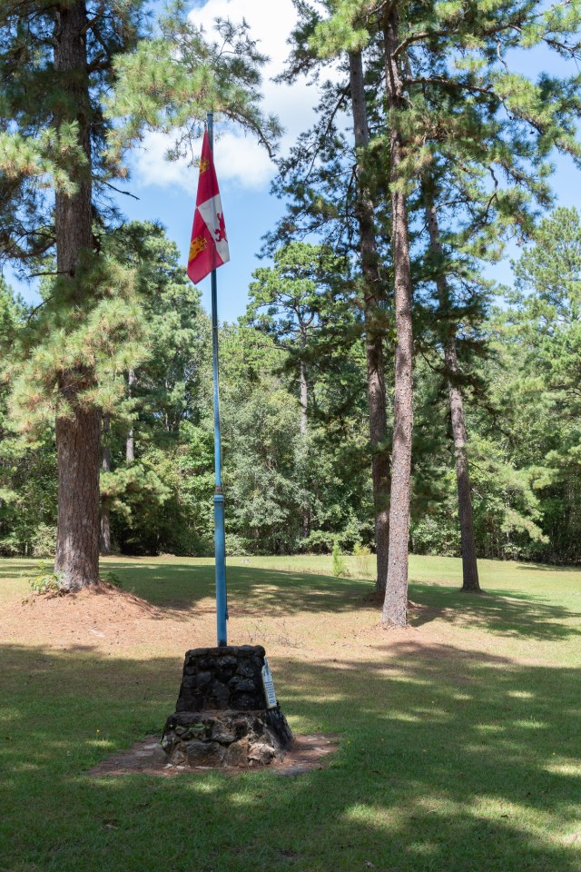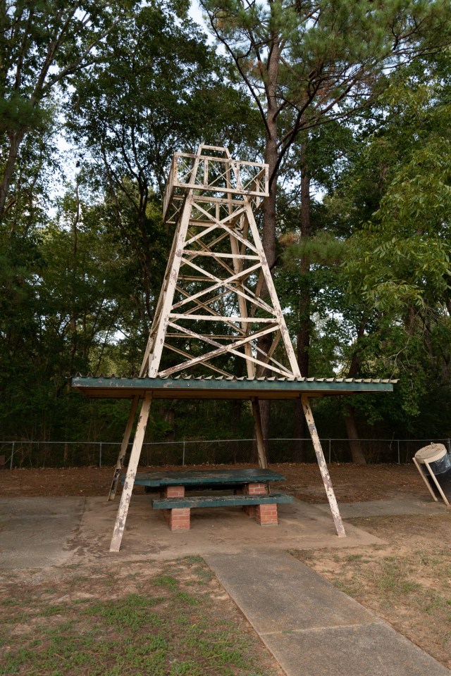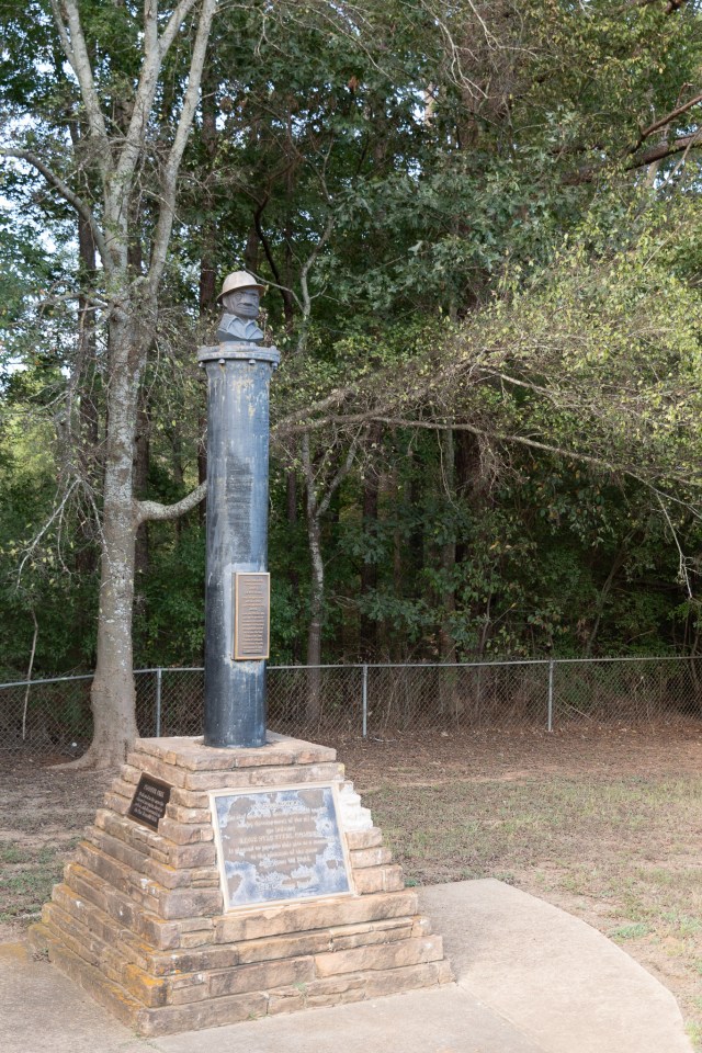 From there we crossed the aforementioned Sabine into Texas and passed through the Sabine National Forest. Then we headed up past Henderson to Joinerville, TX, where we found Joe Roughneck waiting for us! Well, a monument to that oilfield mascot, anyway. The pipe that Joe’s head is mounted on, so to speak, is a time capsule dedicated in 1957. Provided by Lone Star Steel, a company that made (and I think still makes) a lot of the pipe used in the industry. I’m not sure if they made the pipes used in the drilling rig covers over the nearby picnic tables…