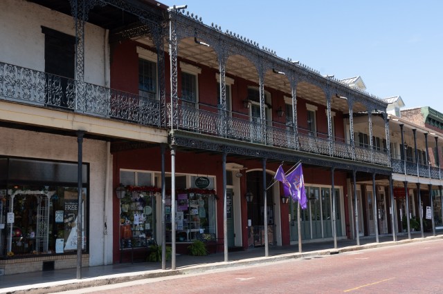 From there we visited Natchitoches’ historic Front Street, along the bank of the Red River. Yes, the Red River that forms that squiggly border between Texas and Oklahoma! It winds a ways through Louisiana and runs into the Atchafalaya. At any rate, they have some nice old buildings, as you see here. I believe the purple flags are for the Northwestern State University Demons!